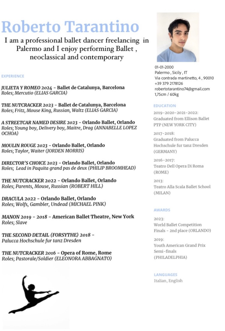 All dancersRoberto TarantinoPractice3 stylesPractice3What they danceStylesClassical BalletNeoclassicalContemporaryCurrently seekingCompanyGallery8Selected images